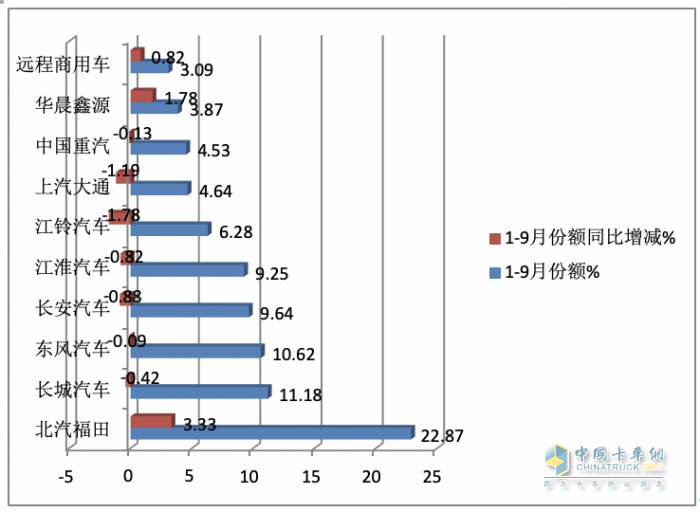特点八、1-9月累销中,福田霸榜,长城、东风分别居第二、第三;TOP10同比8增2降,远程领涨;市场份额同比3增7减,福田增加最多