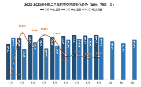 今年以来国内二手车业务增长明显,流通协会数据显示,2023年9月,全国二手车市场交易159.16万辆,环比增长2.07%,同比增长7.17%,交易金额为1040.39亿元;1-9月累计交易1349.18万辆,同比增长12.61%,累计交易金额为8597.90亿元。