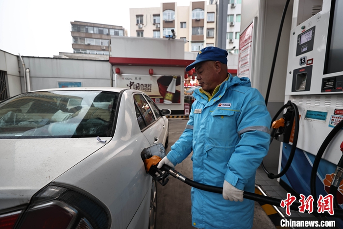 1月17日,山西太原,车辆在加油站加油。当日,中国国家发展和改革委员会发布消息称,根据近期国际市场油价变化情况,按照现行成品油价格形成机制,自2024年1月17日24时起,国内汽、柴油价格每吨均降低50元人民币。 中新社记者 张云 摄