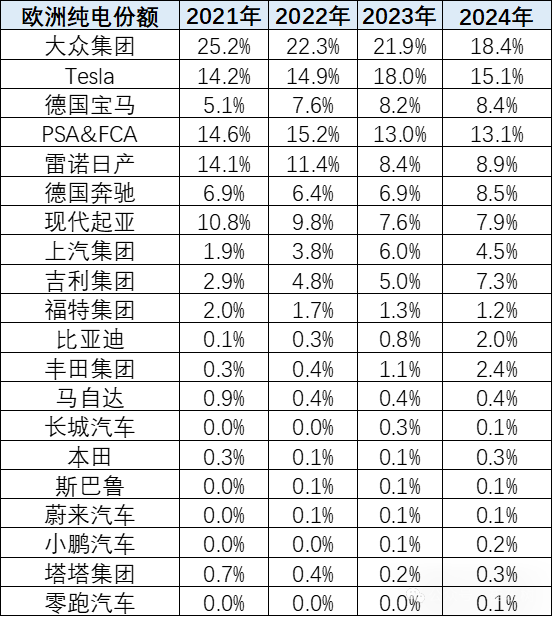 中国车企在欧洲纯电动市场表现较强。上汽表现很好。特斯拉的欧洲表现相对稳定。中国上汽集团、比亚迪和长城、吉利的欧洲纯电动表现较好。蔚来和小鹏的欧洲市场也有突破。