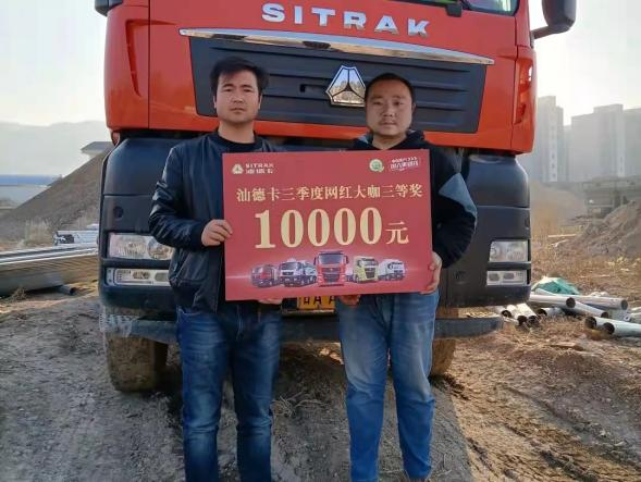 导读:近日,中国重汽汕德卡“三季度网红大咖赛”颁奖典礼成功举办,此次河南地区1位汕德卡卡友荣获一等奖,现金奖励3万元。