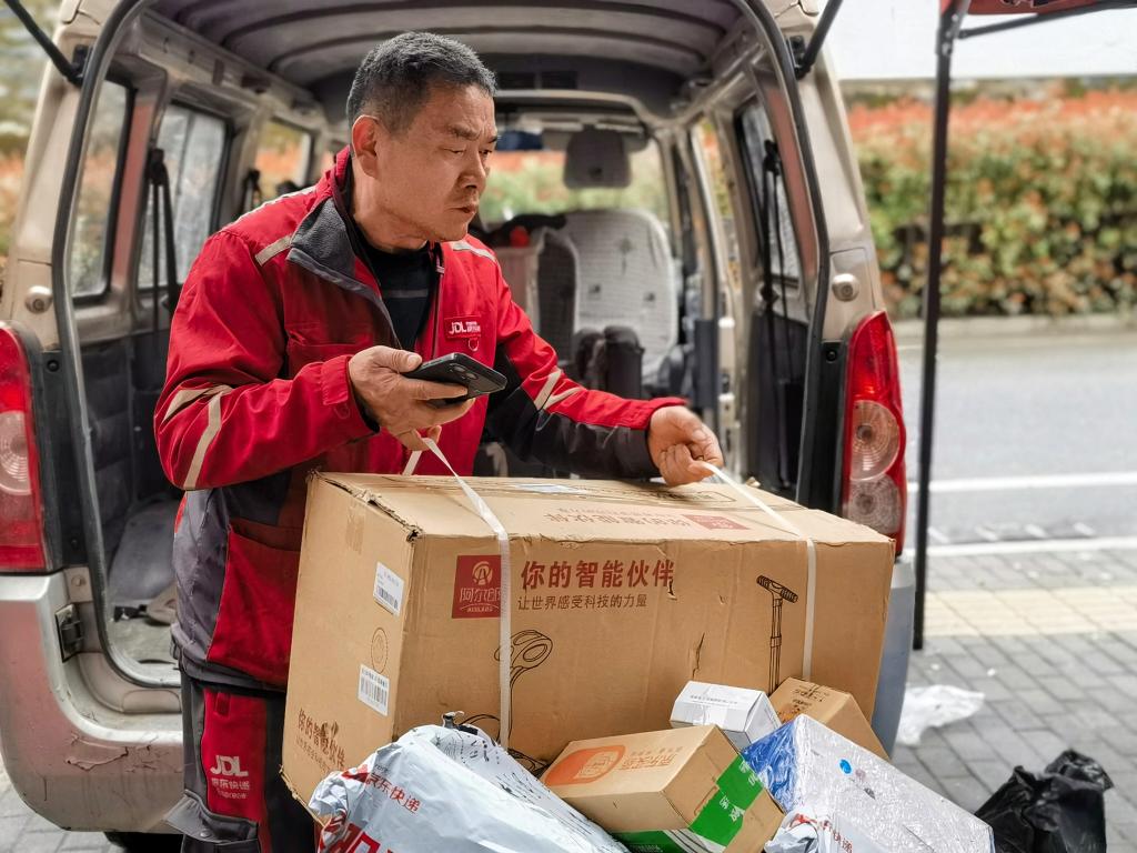 清晨六点,位于皖南山区腹地的石台县城,京东快递站里的灯光亮得晃眼。56岁的檀世旺蹲在满地包裹间,粗糙开裂的指尖划过一个个快递面单。