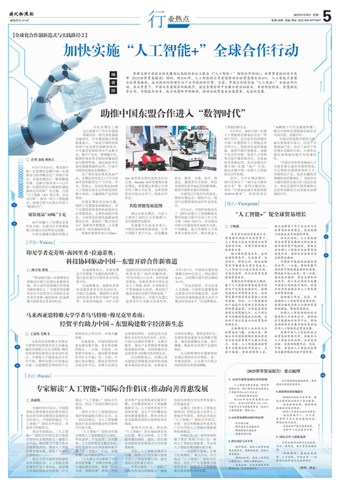 李强总理日前在全球发展倡议高级别会议上提出《“人工智能+”国际合作倡议》;世界贸易组织近日发布《2025世界贸易报告》预测,到2040年,人工智能的应用有望推动全球贸易增长近40%。人工智能正重塑全球贸易格局,成为推动经济增长与产业升级的新引擎。当前,中国正加快实施“人工智能+”全球合作行动,在此背景下,中国与东盟国家积极携手,通过东博会等平台展示前沿AI技术、布局智能制造、智慧物流等应用,实现技术共享、能力共建和市场联动,推动全球贸易走向高质量、包容性发展。