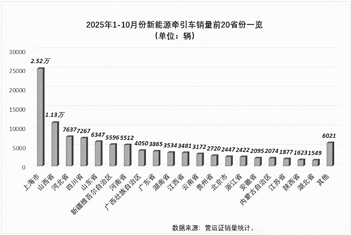 截止到10月份,2025年新能源牵引车累计销量超过百辆的省级行政区已有29个,超1000辆的省级行政区达到23个,超2000辆的省级行政区都有17个,上海、山西、河北、四川、山东、新疆、河南等7省(市、自治区)累计销量已超过5000辆,广西、广东、湖南、江西和云南等5省(市、自治区)累计销量也超3000辆(如上图)。