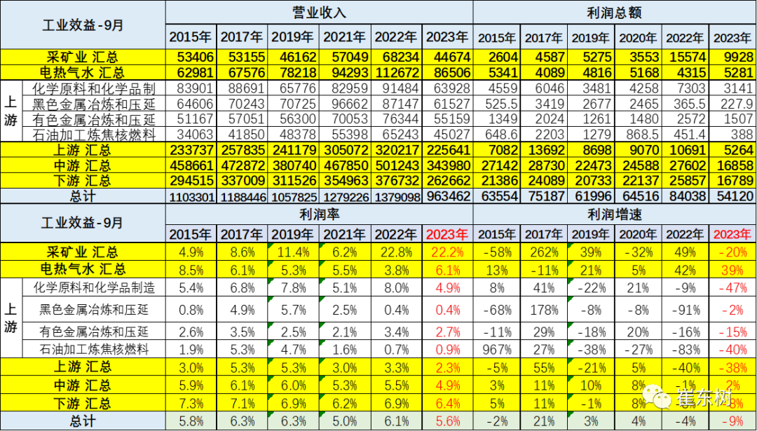 2023年1-9月份,煤炭、有色、钢铁行业利润最高,近期的黑色金属采选业的利润率增长惊人。石油行业利润增长,利润率上升到34%。