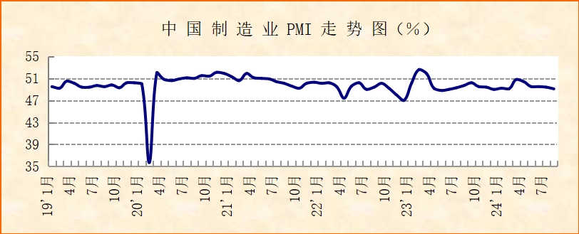 中国物流与采购联合会、国家统计局服务业调查中心发布的2024年8月份中国制造业采购经理指数(PMI)为49.1%,较上月下降0.3个百分点,连续4个月保持在49%以上,结合前期走势,经济运行整体相对稳定。从分项指数变化来看,市场供需略有放缓,新动能较快回升,市场价格明显下降,企业成本有所减轻,后期经济具备稳定回升基础。