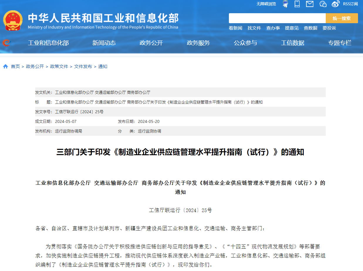 5月20日,工业和信息化部办公厅、交通运输部办公厅、商务部办公厅印发《制造业企业供应链管理水平提升指南(试行)》,提出从多个方面引导制造业企业提升供应链管理水平。