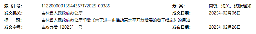 吉林省人民政府办公厅印发《关于进一步推动高水平开放发展的若干措施》的通知