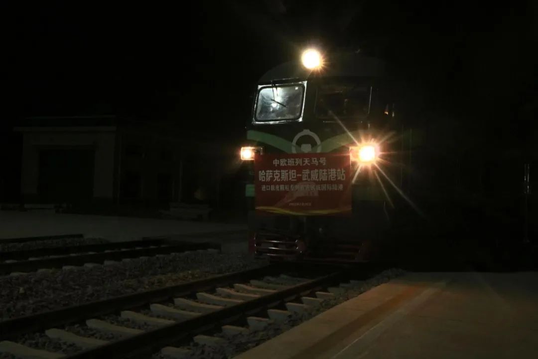 2月25日,75128次中欧班列“天马号”一体化通关麸皮颗粒专列顺利抵达甘肃(武威)国际陆港铁路口岸站,这是甘肃(武威)国际陆港集装箱铁路场站首次迎来国际货运班列。