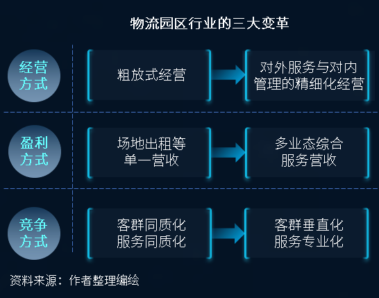 得益于我国经济总量的稳步提升,物流园区数量稳步增加。然而,伴随我国经济深入换挡升级,物流园区由单纯的数量增长迈向质量提高与结构调整的方向变革。物流园区正在由粗放式、同质化的阶段,加速进入精细化、专业化的发展阶段,正在经历以下三大变革: