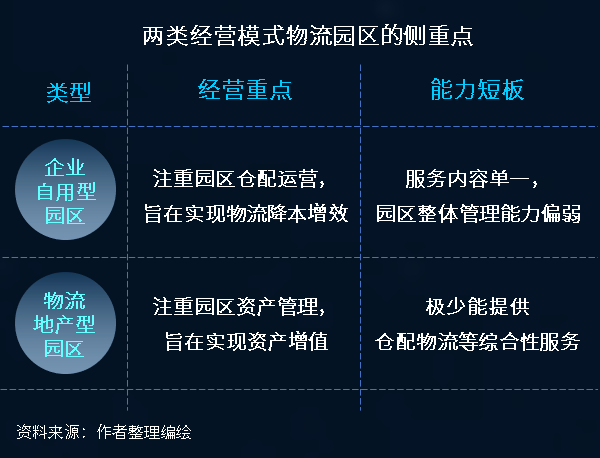 从物流园区的市场格局来看,物流园区因经营模式各有不同,在发展过程中形成了两种类型的物流园区,其能力侧重点各有不同。