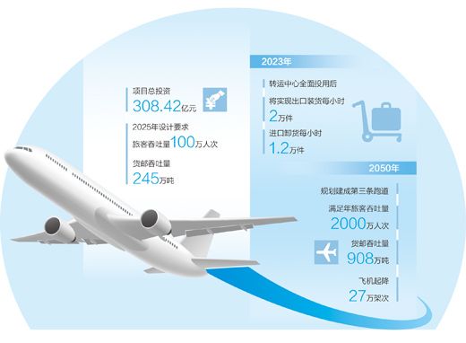 鄂州花湖机场是专业货运枢纽机场,按照满足2025年旅客吞吐量100万人次、货邮吞吐量245万吨的要求设计。机场投用后,1.5小时飞行圈可覆盖全国90%的经济总量、80%的人口;全面开启国际货运功能后,将开通大阪、法兰克福等国际货运航线。