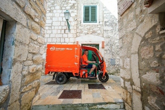 图片说明:在克罗地亚小镇历史悠久的狭窄街道中送货,电动三轮车是理想选择。