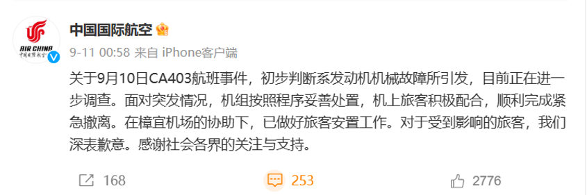 此前(9月10日),从成都飞往新加坡的国航CA403航班在着陆前客舱出现烟雾,左侧发动机起火。落地后,机组人员组织旅客实施紧急撤离,新加坡樟宜机场第三跑道短暂关闭。据中国国际航空官方微博,该航班机型为A320neo,初步判断(事件)系发动机机械故障所引发。
