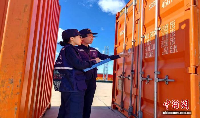 同江海关关员核验集装箱信息。 同江市委宣传部供图
