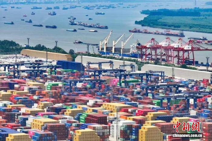 2025年7月14日,航拍长江沿线南京龙潭港进出口集装箱码头(无人机照片)。中新网记者 泱波 摄