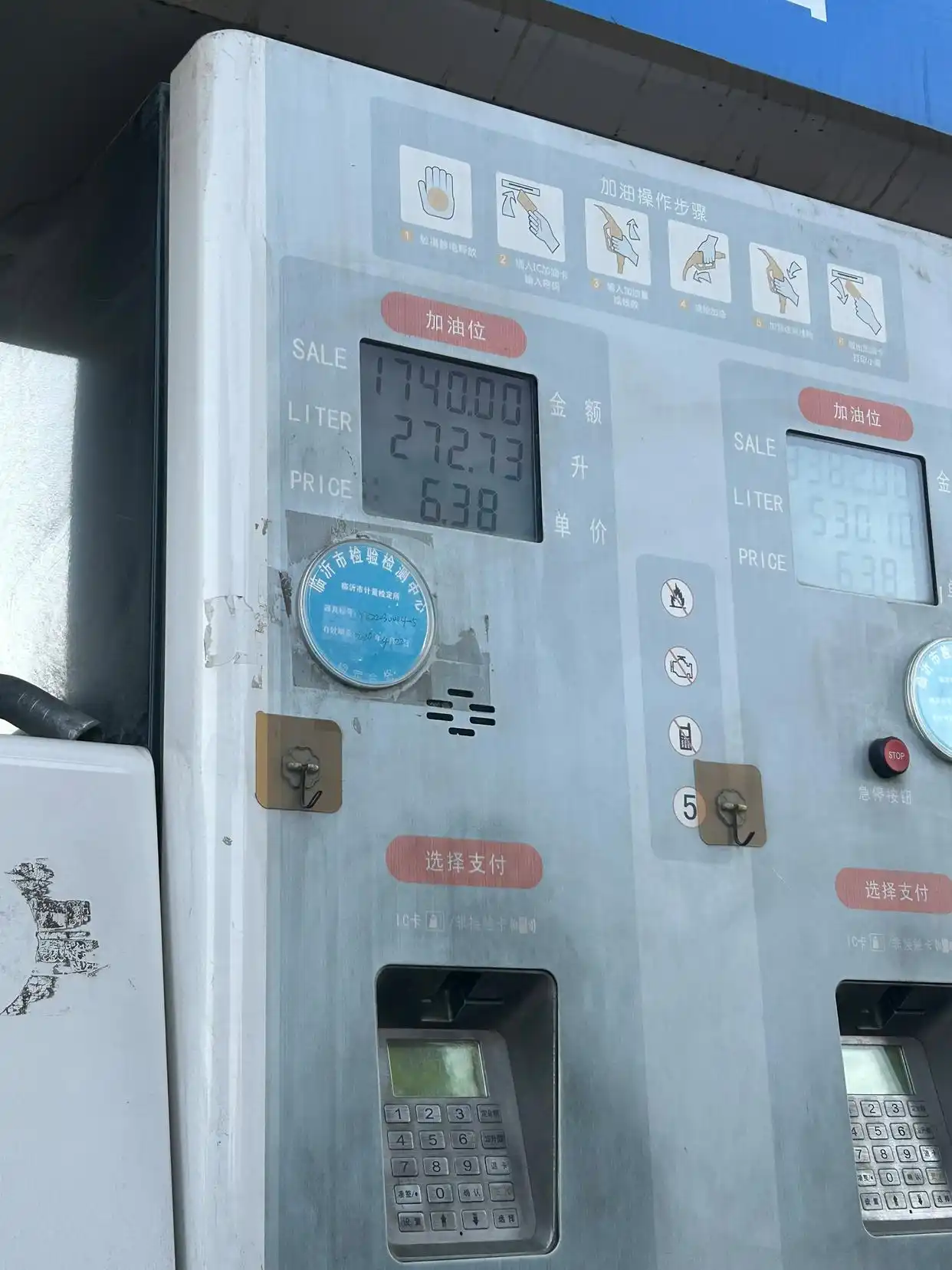 正在加油的货车司机,担心油价一天多变,只要油箱空着就加上。