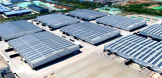 以“宜建尽建”为原则,物流园统筹规划自有办公楼、仓库、厂房等建筑屋顶空间资源,使用光伏组件约6万平方米,搭建自由供电站,所发电力通过升压变压器送出使用,形成清洁能源局部供应能力。每年,这里能够发出“绿电”总量约600万度,全面减少碳排放和能源消耗。