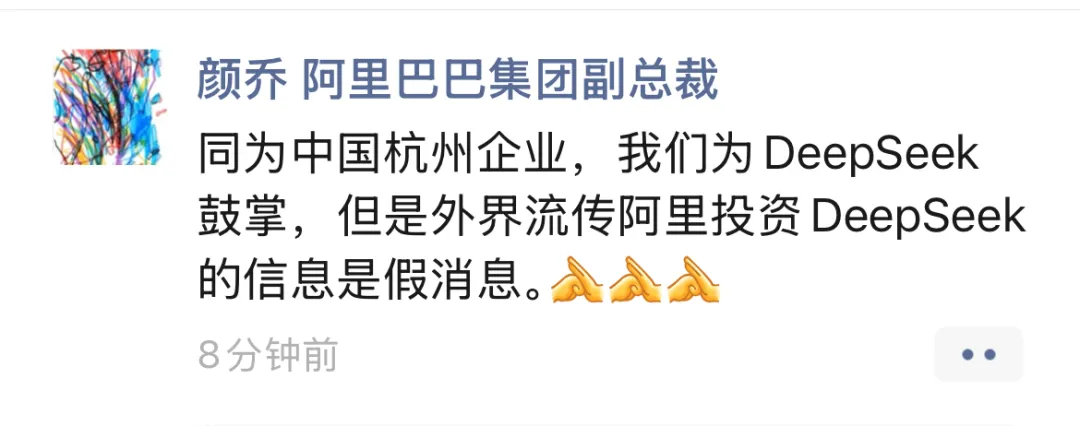2月7日消息,有传闻称,阿里计划以100亿美元的估值,投资10亿美元,认购DeepSeek股权。对此,阿里巴巴集团副总裁颜乔在朋友圈表示,同为中国杭州企业,阿里为DeepSeek鼓掌,但是外界流传阿里投资DeepSeek的信息是假消息。