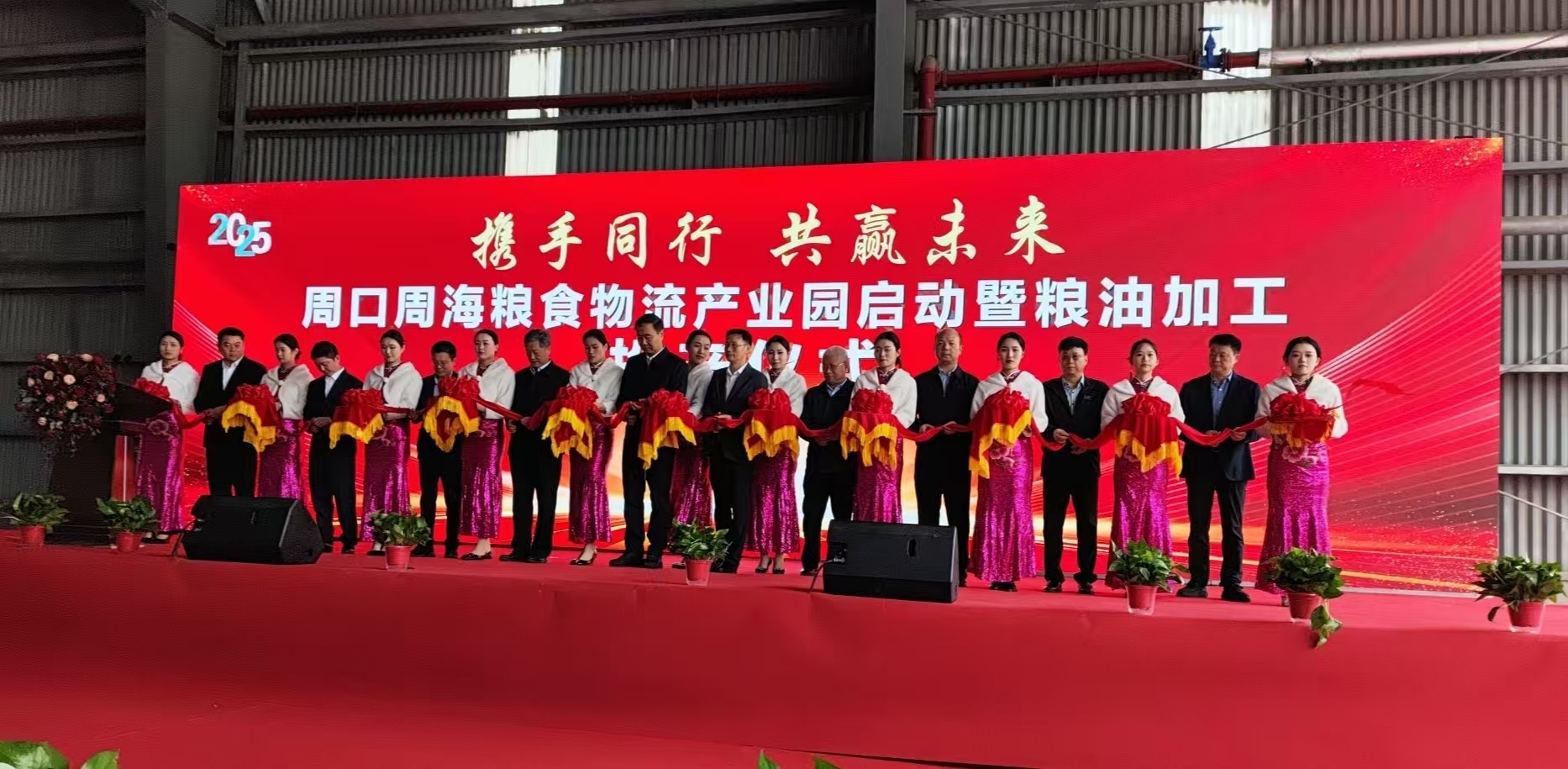 金秋时节,硕果飘香。10月16日,周口周海粮食物流园区启动暨周海粮油投产仪式在项城港周海粮油厂区隆重举行。随着日处理4000吨大豆生产线的投产,这个总投资30亿元的综合性园区正式开启运营新程。来自湖南岳阳、河南周口、项城三地市的政府代表、企业嘉宾及行业合作伙伴约150人齐聚一堂,共同见证区域粮食产业发展的重要时刻。