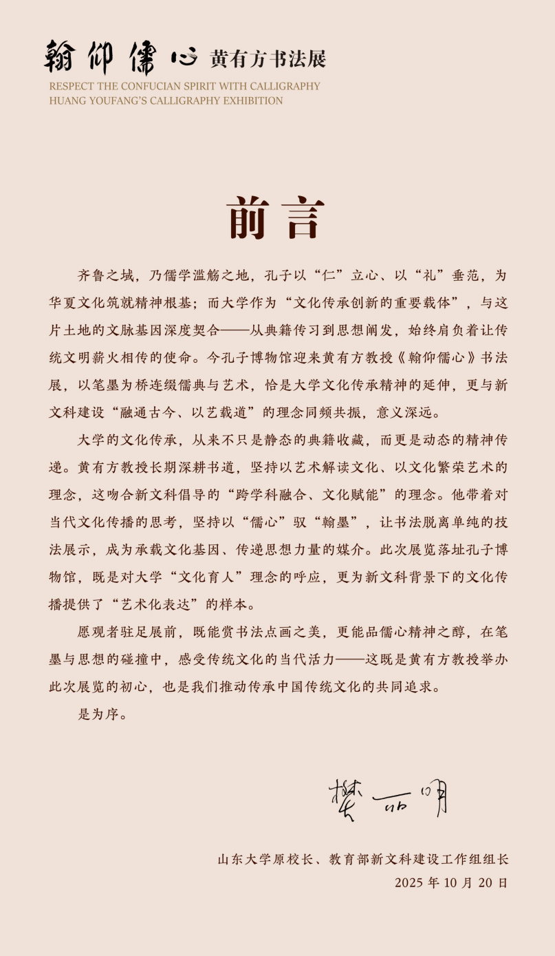 2025年11月2日上午,《翰仰儒心——黄有方书法展》在山东曲阜孔子博物馆临展二厅正式拉开帷幕。本次展览由孔子博物馆和济宁能源发展集团主办,济宁港航集团、济宁学院、曲阜师范大学、济宁市文化交流协会、宁波大学、上海朵云轩集团、上海觉群书画院、上海文化发展基金会长青文化专项基金、全球捷运、韵达集团和上海中喜物流有限公司协办,展览汇集黄有方教授近年创作的书法精品100余件(组),全面展现其在篆、隶、楷、行、草诸体上的深厚造诣与独特风格。
