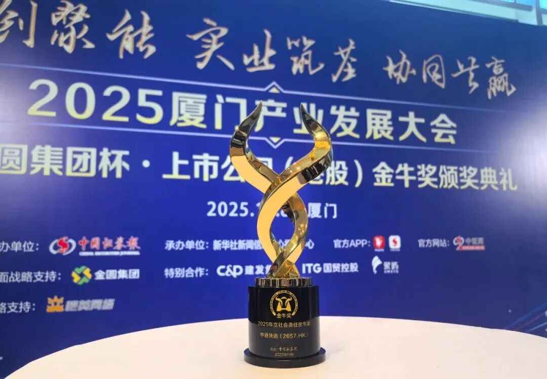 11月8日,由中国证券报主办、新华社新闻信息中心福建中心承办的上市公司(港股)金牛奖颁奖典礼于厦门举行,中通快递集团荣获“中国证券报上市公司(港股)金牛奖·社会责任金牛奖”。