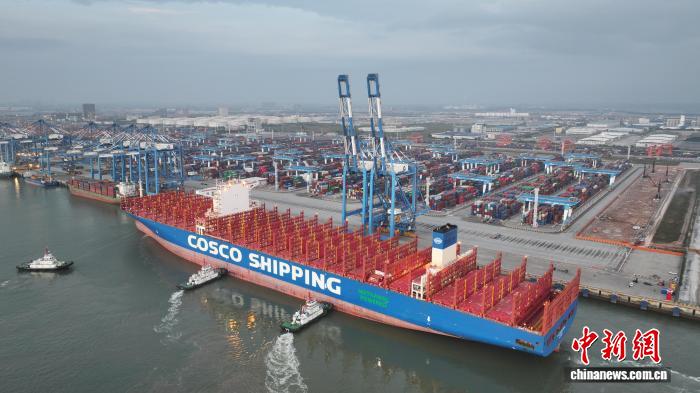 9日傍晚,20万吨级集装箱船“中远海运双子座”轮顺利靠泊广西北部湾港钦州自动化集装箱码头9号、10号泊位,北部湾港迎来建港以来吨位最大、船长最长的集装箱船舶。