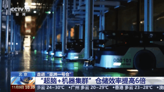 随着机器人员工的加入,通过镜头,大家可以看到,整座仓库的占地面积有3000多平方米,相当于7个标准篮球场的大小。12米高的货架能储备上万个箱子的货品,相当于一个小型超市的全年备货量。所以,仓储效率提高的第二个原因是空间的高效利用。