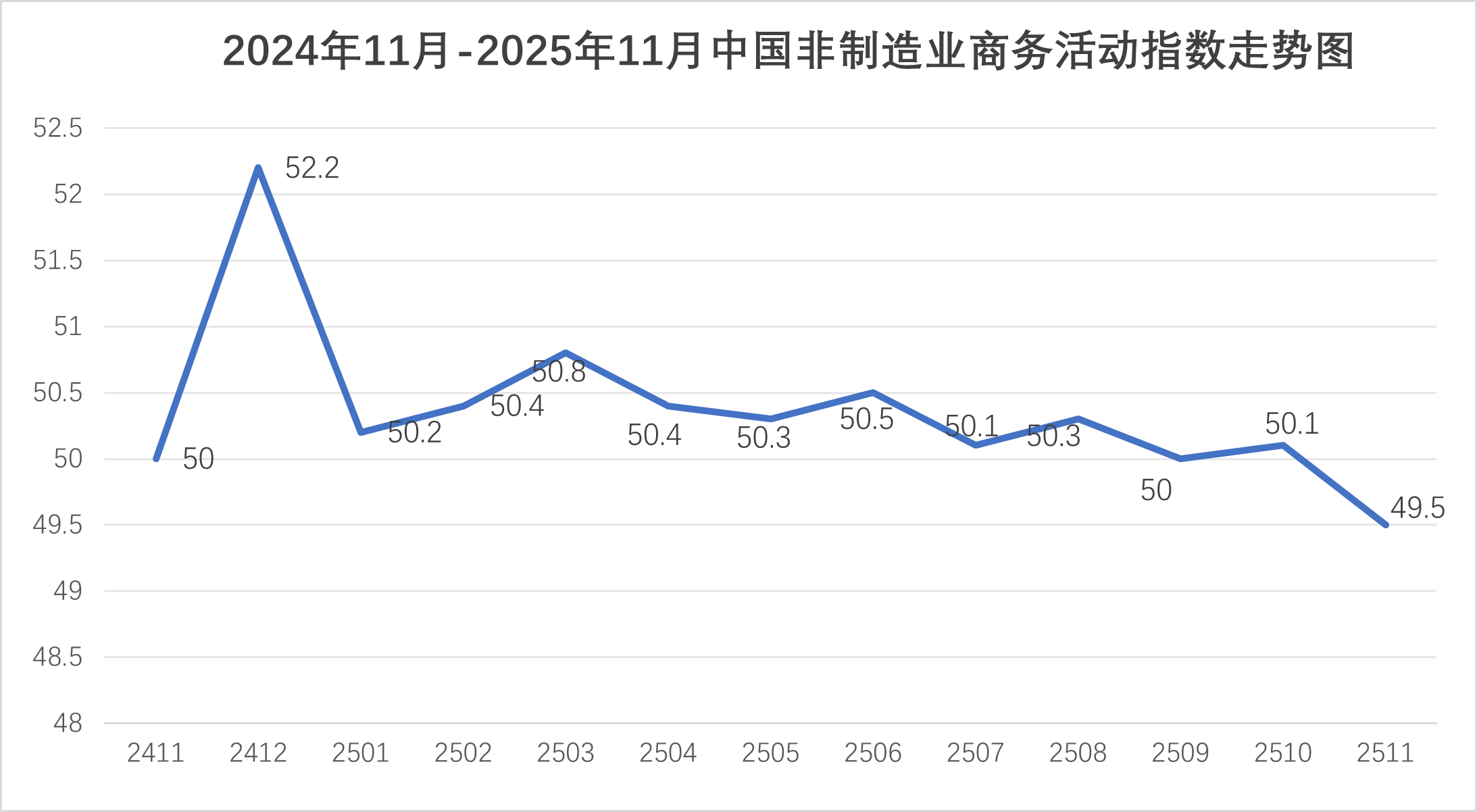 国家统计局服务业调查中心、中国物流与采购联合会发布的2025年11月份中国非制造业商务活动指数为49.5%,环比下降0.6个百分点。由于非制造业没有综合指数,通常以商务活动指数来反映非制造业经济的总体变化。