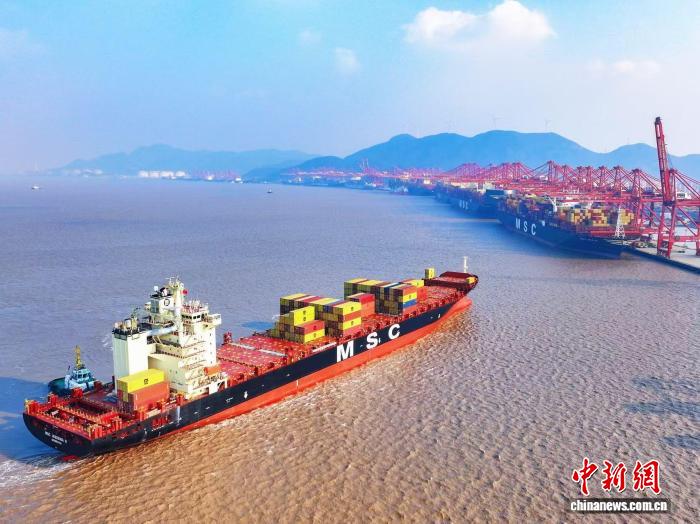 1月8日,随着澳大利亚航线首航货船“地中海杰西尼亚”轮靠泊宁波舟山港穿山港区,宁波舟山港迎来2026年首条新航线。