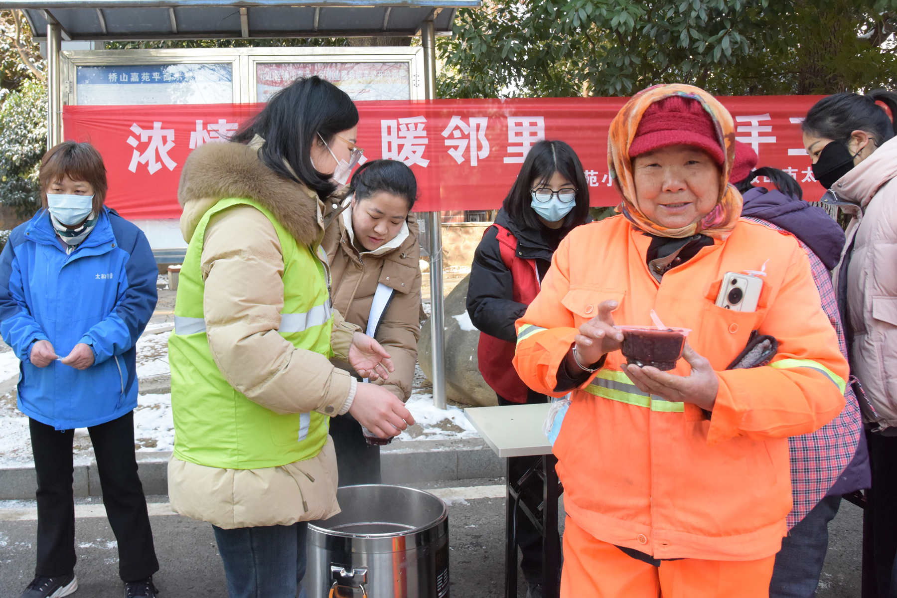 1月21日上午,马鞍山市花山区江东街道桥山嘉苑党支部联合太和物业公司,组织党员、楼栋长开展“浓情腊八暖邻里 趣味手工聚人心”主题活动。物业工作人员准备了精心熬制的腊八粥和创意制作的蒜头娃娃,党员、楼栋长、网格员们将一碗碗热气腾腾的粥送到居民、快递员、保洁员们的手上,让大家品尝传统节日的美食滋味,增进了社区、物业与居民之间的情感交流。