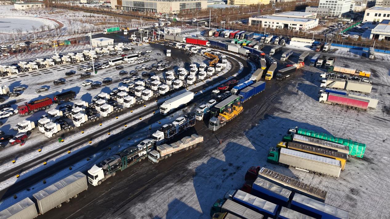 (在霍尔果斯公路口岸,各式运输车辆有序排队通关)