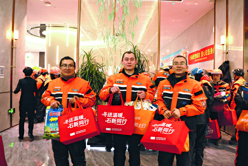 外卖骑手收到暖“新”礼包。 记者 柳安臣 摄