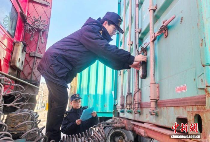 图为海关工作人员为集装箱施加电子关锁。刘汇 摄