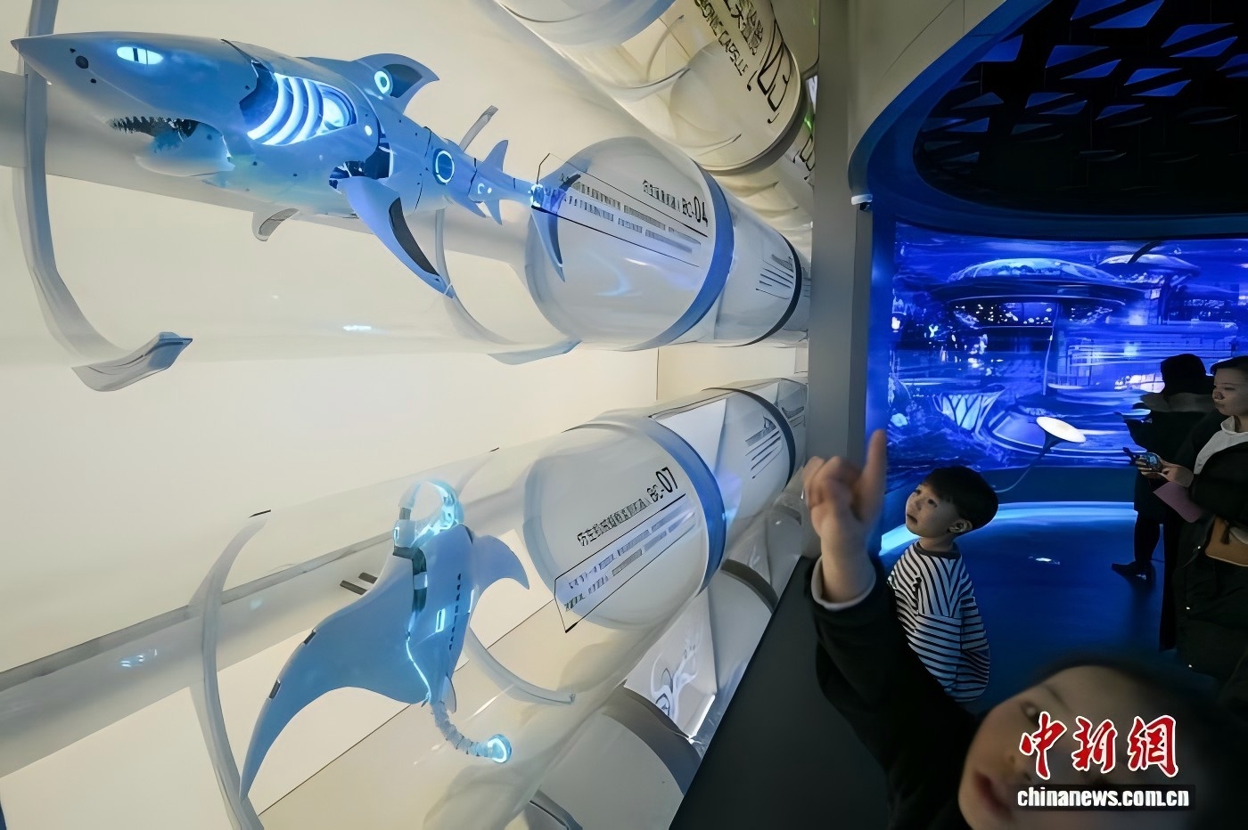 1月30日,游客在位于天津滨海新区的国家海洋博物馆“未来海洋”展厅参观各种海洋仿生机器人。 中新社记者 佟郁 摄