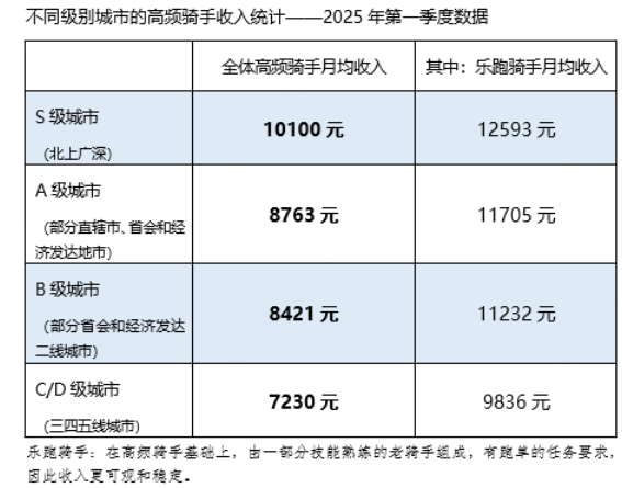 相比2024年第四季度,2025年开年以来骑手收入环比增长明显。北上广深等一线城市高频骑手一季度收入环比增长约12%,三四五线城市骑手收入环比增长超过8.5%。综合来看,全国主要城市地区的高频骑手月均收入环比增幅超10%。