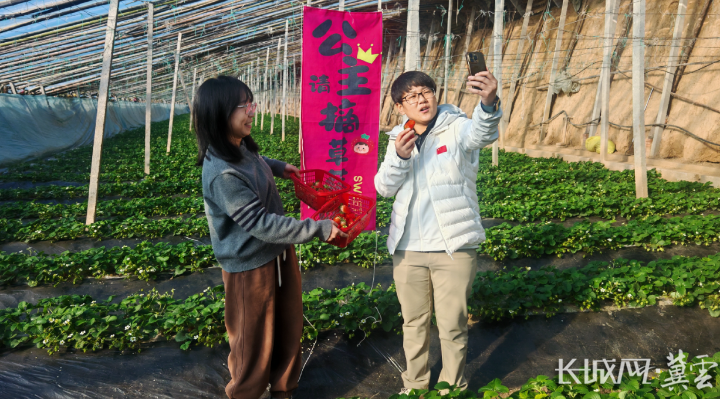 1月12日,保定市定兴县北关社区的蔬果大棚里暖意浓浓,红彤彤的西红柿缀满藤蔓,鲜甜草莓静待成熟。社区干部翟梦楠手持刚摘的草莓,对着手机镜头笑意盈盈:“家人们,再过几天就能采摘,自然熟无农药,咬一口满嘴清甜!”