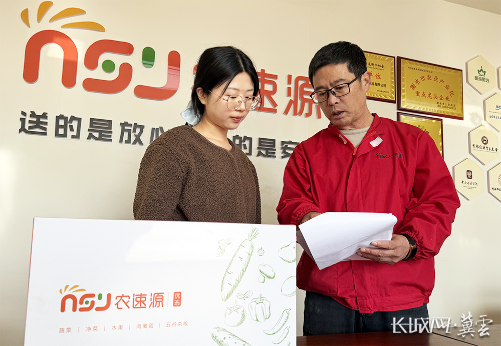邢永亮(右)和同事核对净菜加工订单对接情况。长城网·冀云客户端记者 卢婉凤 摄