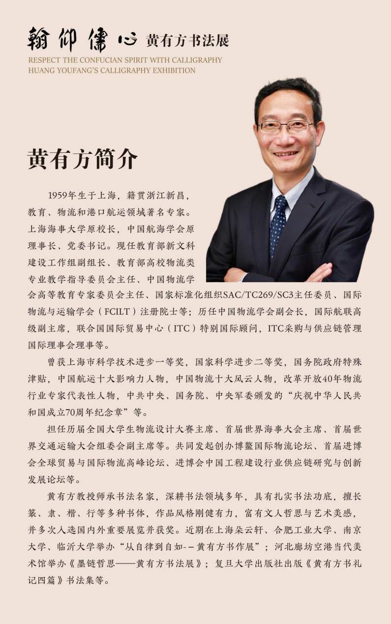 2025年11月2日上午,《翰仰儒心——黄有方书法展》在山东曲阜孔子博物馆临展二厅正式拉开帷幕。本次展览由孔子博物馆和济宁能源发展集团主办,济宁港航集团、济宁学院、曲阜师范大学、济宁市文化交流协会、宁波大学、上海朵云轩集团、上海觉群书画院、上海文化发展基金会长青文化专项基金、全球捷运、韵达集团和上海中喜物流有限公司协办,展览汇集黄有方教授近年创作的书法精品100余件(组),全面展现其在篆、隶、楷、行、草诸体上的深厚造诣与独特风格。