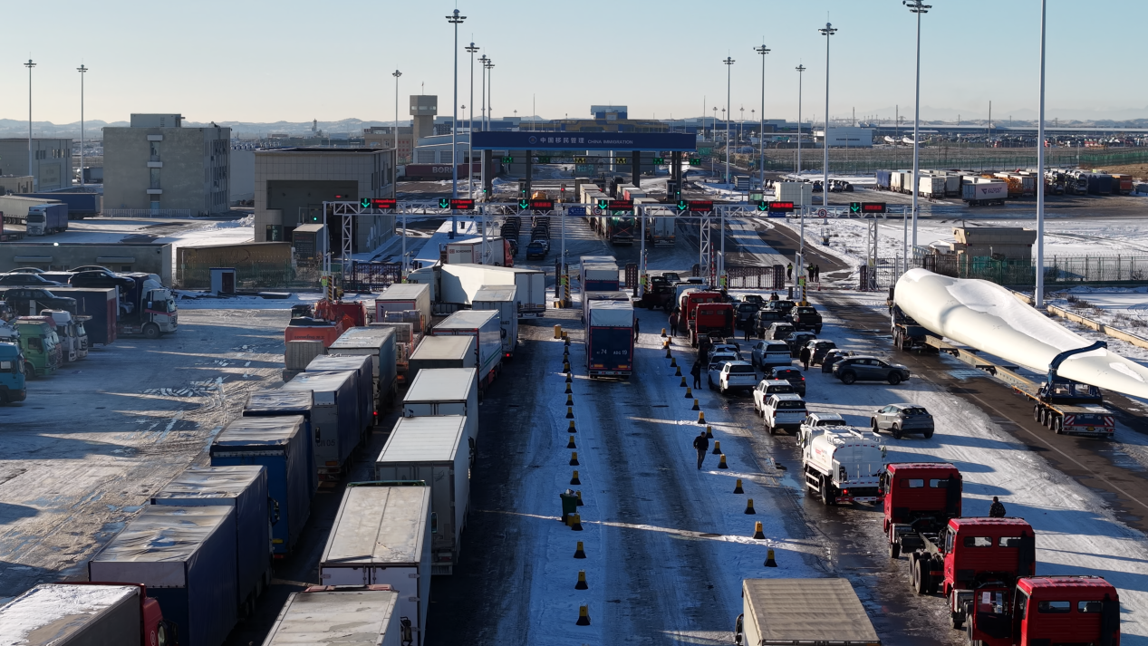 (在霍尔果斯公路口岸,各式运输车辆有序排队通关)