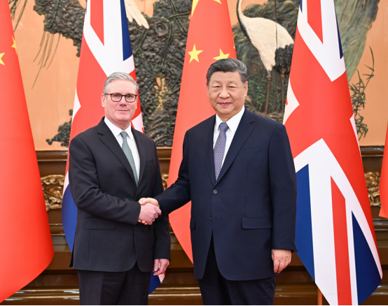 1月29日上午,国家主席习近平在北京人民大会堂会见来华进行正式访问的英国首相斯塔默。双方同意中英要发展长期稳定的全面战略伙伴关系。