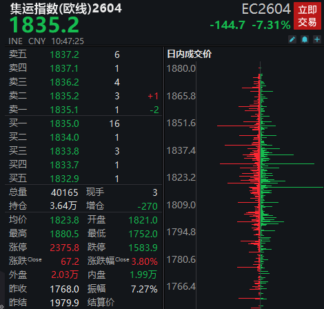 具体来看,截至发稿,上期所原油期货主力合约跌3.8%,报640.4元/桶;集运指数(欧线)主力合约跌7.31%,报1835.2点。