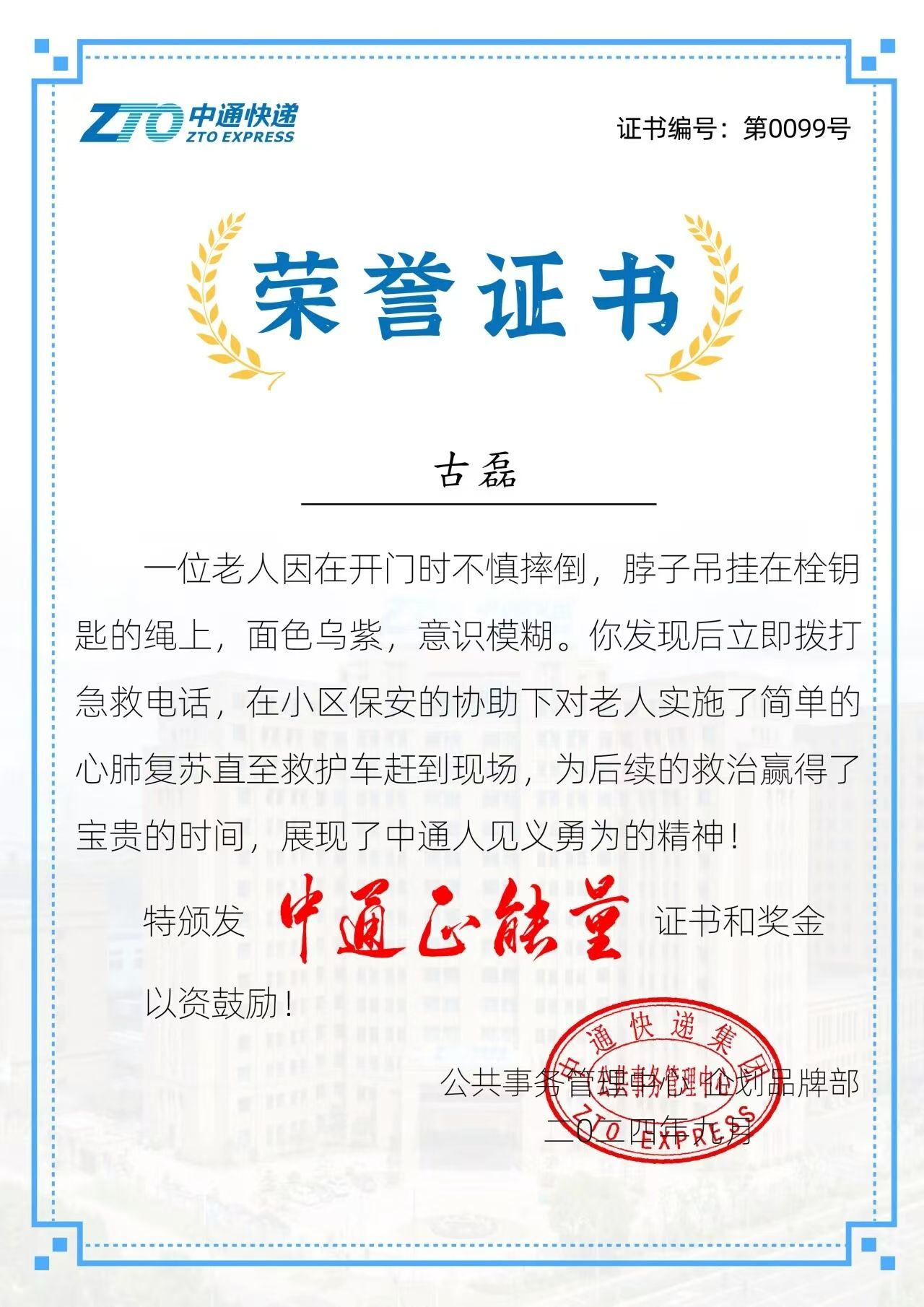 一个半月后,康复出院的老人在家人的搀扶下,提着一面锦旗找到中通网点,向古磊表达感激之情。同时,为表彰古磊见义勇为的行为,2024年9月,依据《中通快递集团表彰奖励管理办法》,古磊被授予“中通正能量”荣誉称号,同时给予现金奖励。