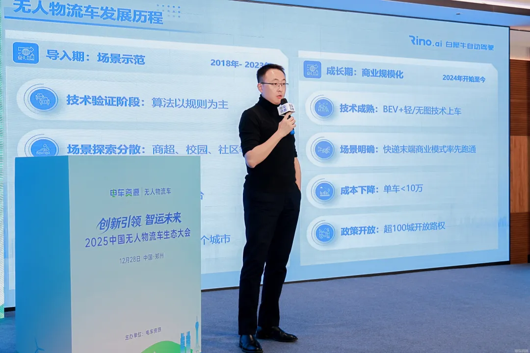 白犀牛副总裁王瀚基从产业生命周期视角注解,2025年是无人物流车元年,行业销量指数级增长,预计达3万台。其与生态伙伴协同打造车规级无人物流车,控制硬件成本,破解传统物流痛点。