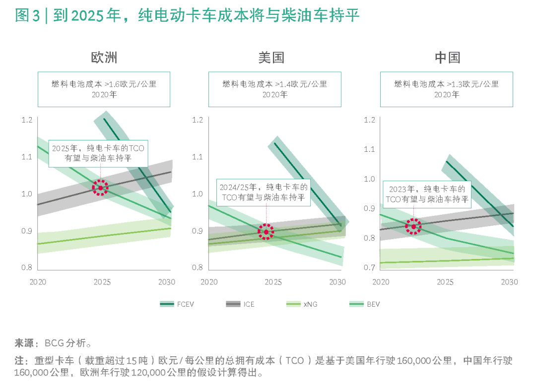 从微观或买家层面来看,车队运营商正在逼近使用零排放卡车的临界点。纯电动卡车的总拥有成本将于2023至2025年间与传统卡车持平,燃料电池卡车亦将于2028至2030年间达成这一目标(参阅图3)。鉴于商业运输的利润极为微薄,电动卡车的成本必须具备足够的竞争力,才能获得车队运营商的青睐。
