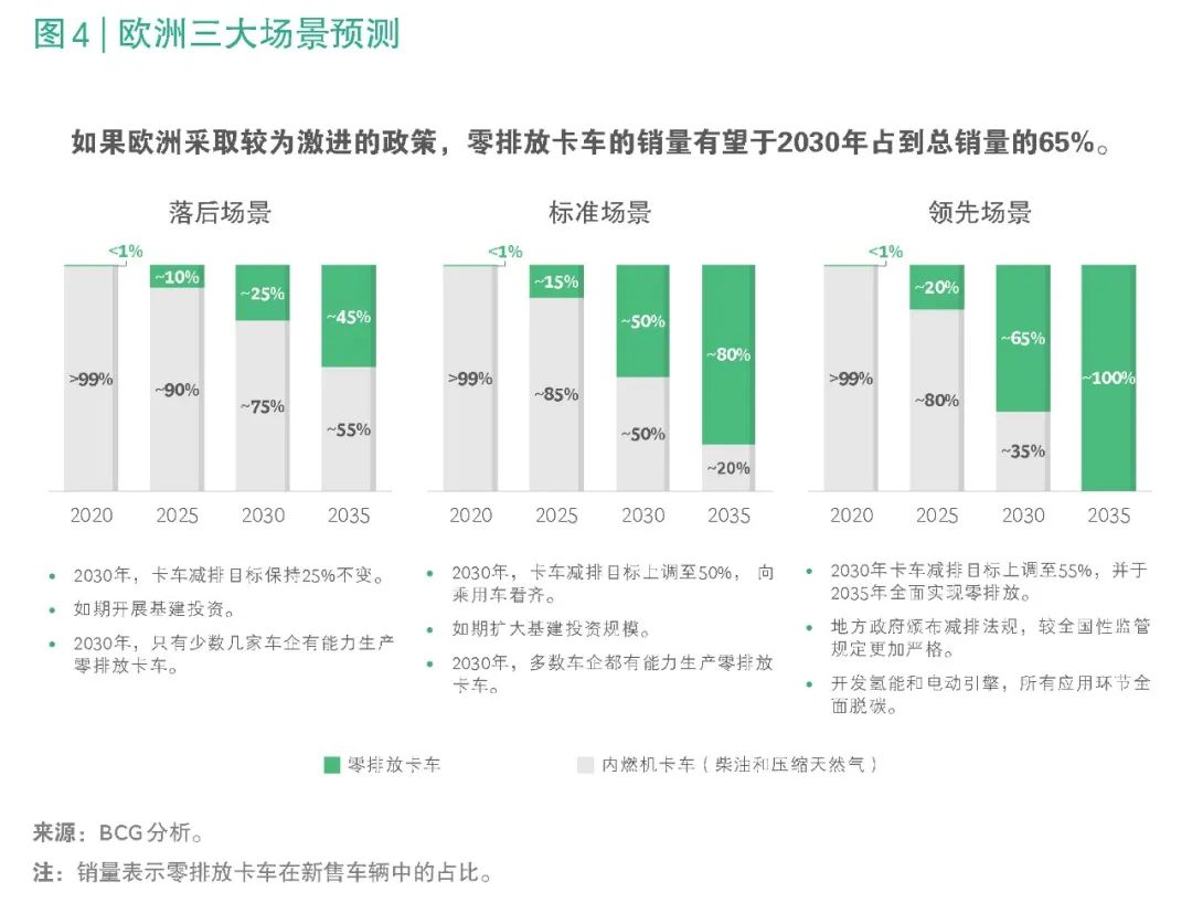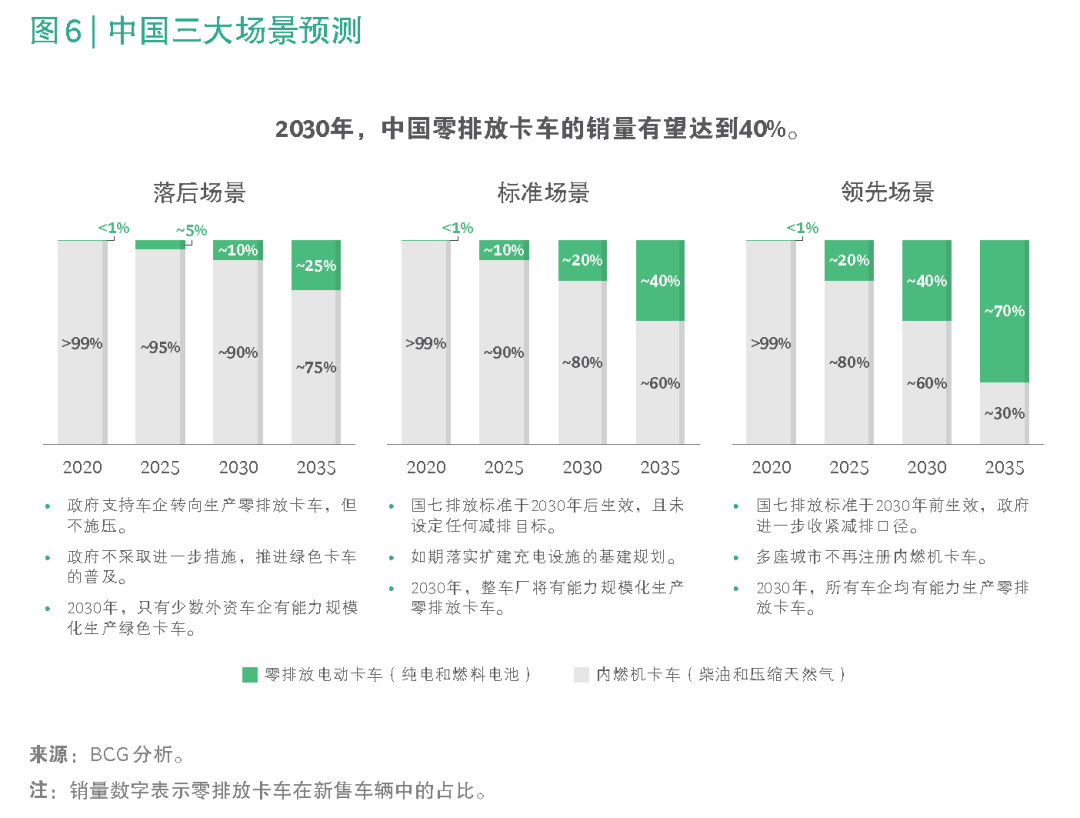 接下来,BCG将通过落后、标准和领先三种场景,清晰描绘出全球三大商用车市场的需求演化之路。