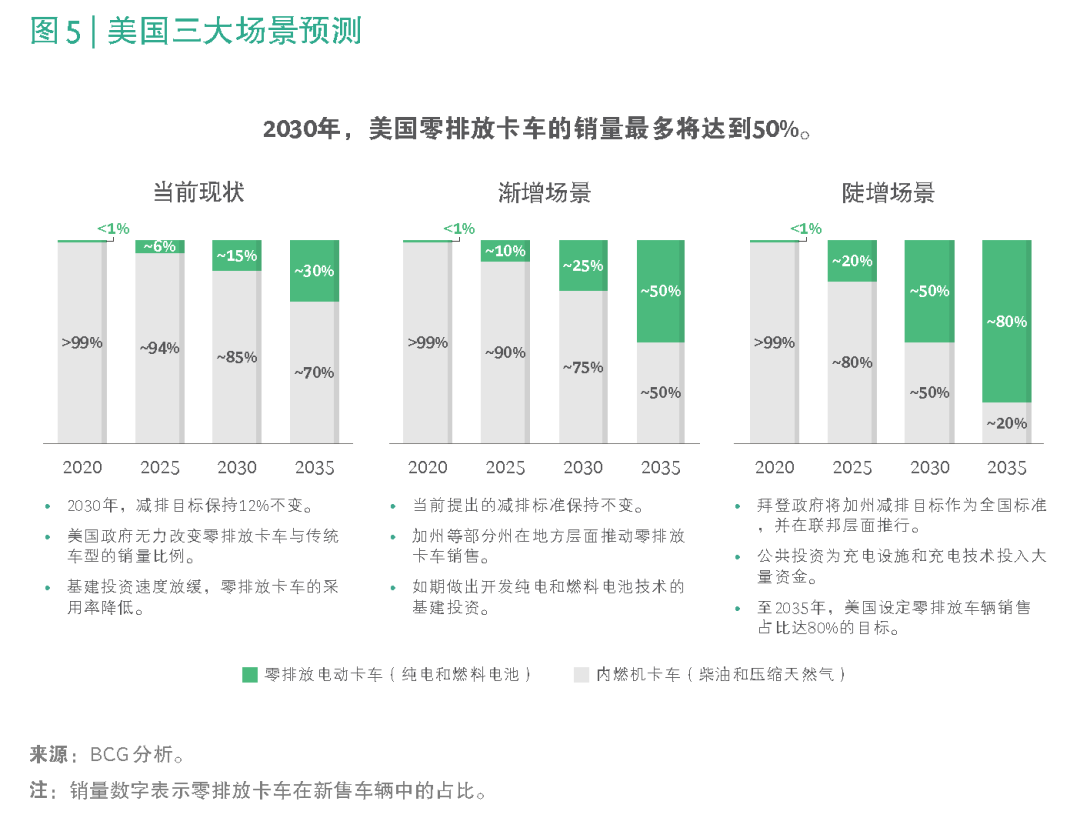 如果今后十年继续保持目前12%的减排目标不变,美国将步入绿色转型的落后场景。在这一场景下,至2030年,市场对零排放卡车的需求仅为15%。鉴于美国已有多州推动绿色卡车的普及,若美国政府逐步提高减排目标,市场对零排放汽车的需求将于2030年达到25%。若拜登政府践行上台时的承诺,将加州的减排目标上升为国家标准,美国便仍有望在绿色转型中占据领先地位。仅此一项,就可将美国市场零排放卡车的销量将推升至50%(参阅图5)。