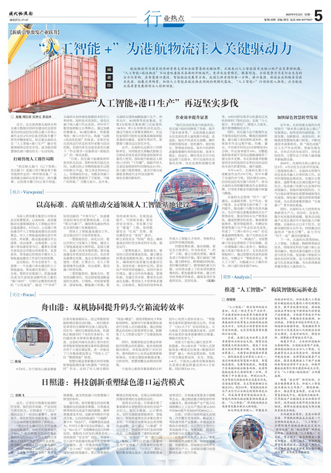 航运物流作为国家经济的重要支撑和全球贸易的关键纽带,正迎来以人工智能技术为核心的产业变革新机遇。“人工智能+航运物流”不仅意味着技术层面的升级迭代,更涉及运营模式、服务形态、全球竞争力乃至行业生态的全方位重构。在智慧港口建设、智能航运发展等方面,我国已跻身国际第一方阵,港口集团、航运企业积极夯实技术底座、拓展应用场景,加快人工智能在航运物流领域的规模化落地。“人工智能+”行动的深入推进,正为航运业高质量发展持续注入创新动能。