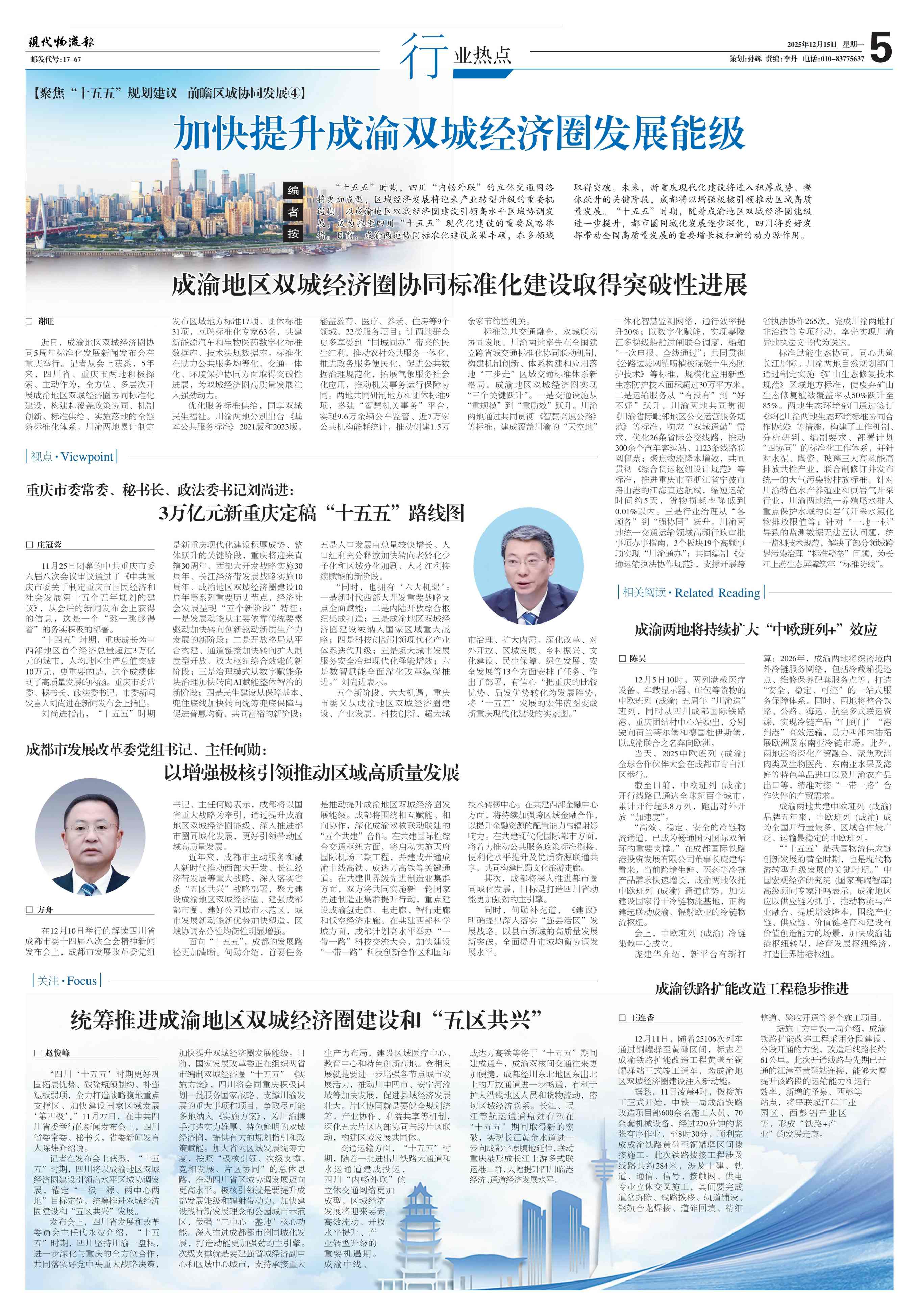 面向“十五五”,成都的发展路径更加清晰。何勋介绍,首要任务是推动提升成渝地区双城经济圈发展能级。成都将围绕相互赋能、相向协作,深化成渝双核联动联建的“五个共建”合作。在共建国际性综合交通枢纽方面,将启动实施天府国际机场二期工程,并建成开通成渝中线高铁、成达万高铁等关键通道。在共建世界级先进制造业集群方面,双方将共同实施新一轮国家先进制造业集群提升行动,重点建设成渝氢走廊、电走廊、智行走廊和低空经济走廊。在共建西部科学城方面,成都计划高水平举办“一带一路”科技交流大会,加快建设“一带一路”科技创新合作区和国际技术转移中心。在共建西部金融中心方面,将持续加强跨区域金融合作,以提升金融资源的配置能力与辐射影响力。在共建现代化国际都市方面,将着力推动公共服务政策标准衔接、便利化水平提升及优质资源联通共享,共同构建巴蜀文化旅游走廊。