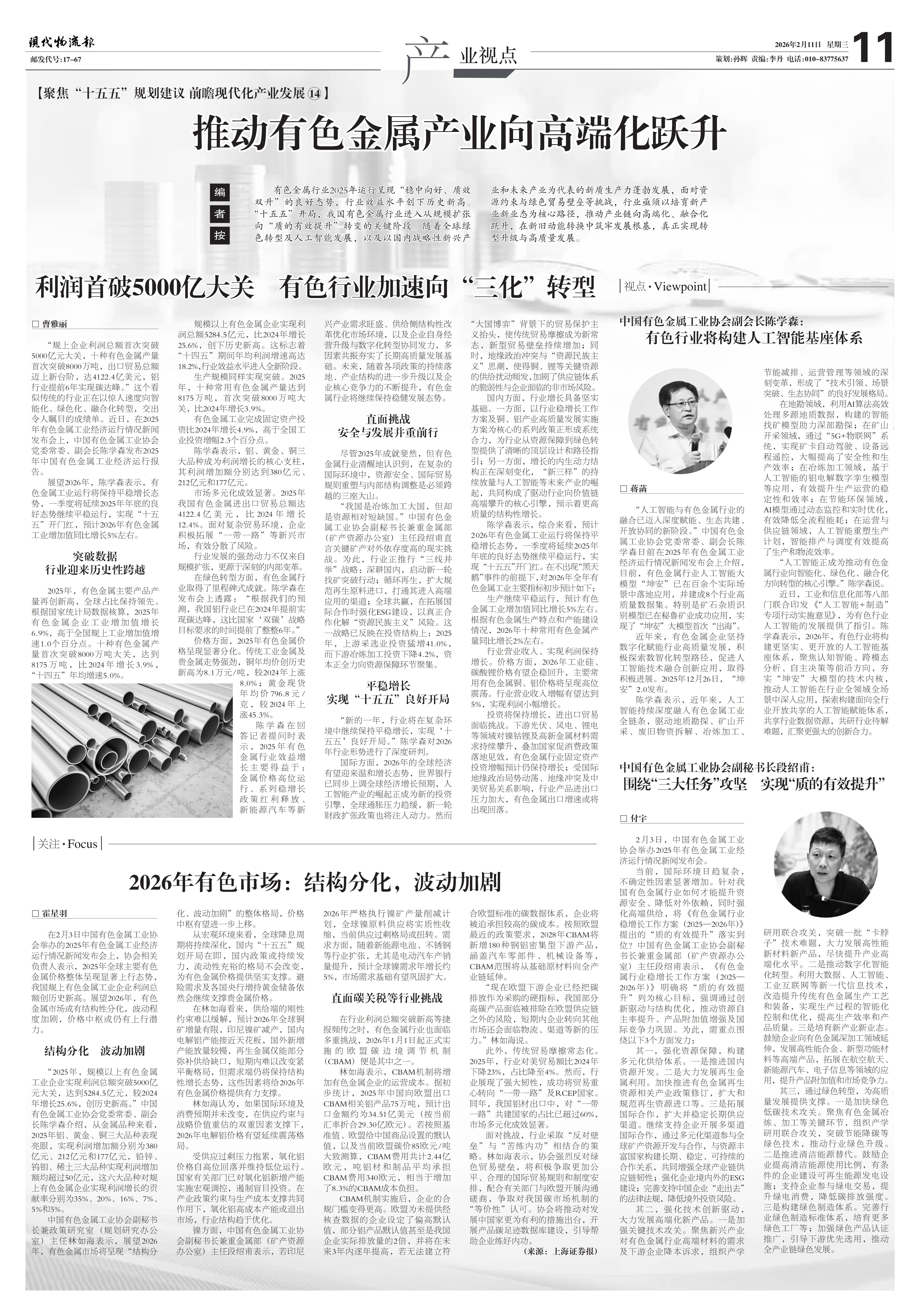 有色金属行业2025年运行呈现“稳中向好、质效双升”的良好态势,行业效益水平创下历史新高。“十五五”开局,我国有色金属行业进入从规模扩张向“质的有效提升”转变的关键阶段。随着全球绿色转型及人工智能发展,以及以国内战略性新兴产业和未来产业为代表的新质生产力蓬勃发展,面对资源约束与绿色贸易壁垒等挑战,行业亟须以培育新产业新业态为核心路径,推动产业链向高端化、融合化跃升,在新旧动能转换中筑牢发展根基,真正实现转型升级与高质量发展。